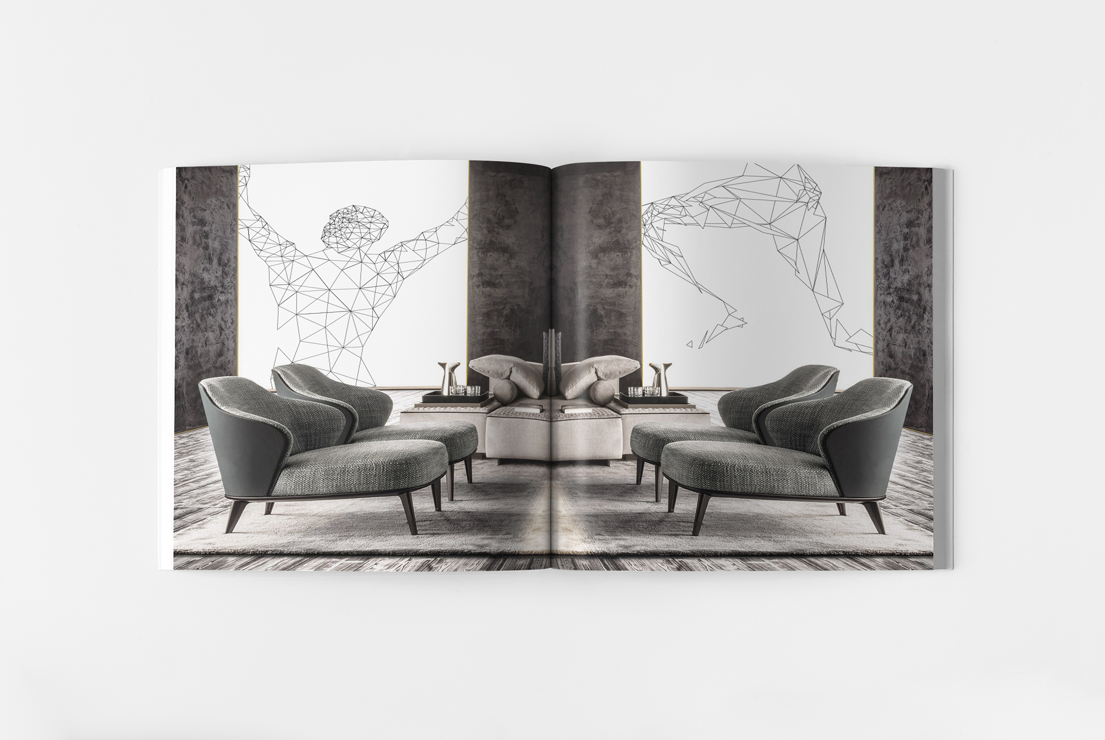 Feine Linien, monochrome Flächen – der Markencharakter wird spürbar, selbst auf Papier.